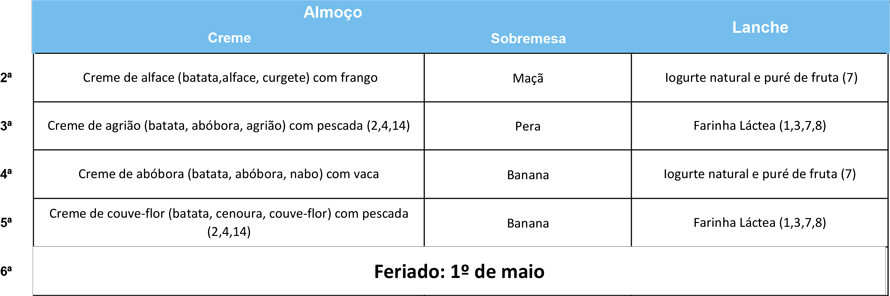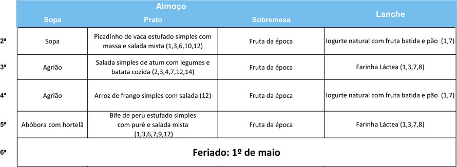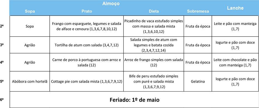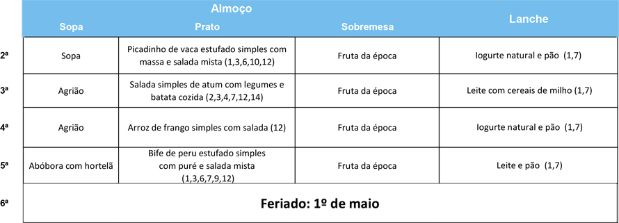 As ementas expostas estão sujeitas a alterações por razões operacionais. Esta ementa pode conter alergénios de forma direta ou cruzada. Qualquer Utente que sofra de alergia ou intolerância alimentar deverá contactar os nossos colaboradores.