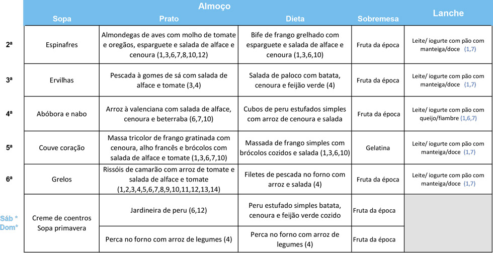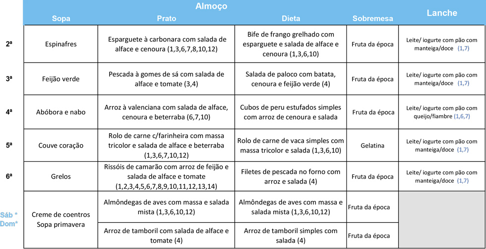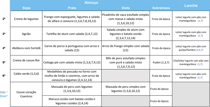 As ementas expostas estão sujeitas a alterações por razões operacionais. Esta ementa pode conter alergénios de forma direta ou cruzada. Qualquer Utente que sofra de alergia ou intolerância alimentar deverá contactar os nossos colaboradores.